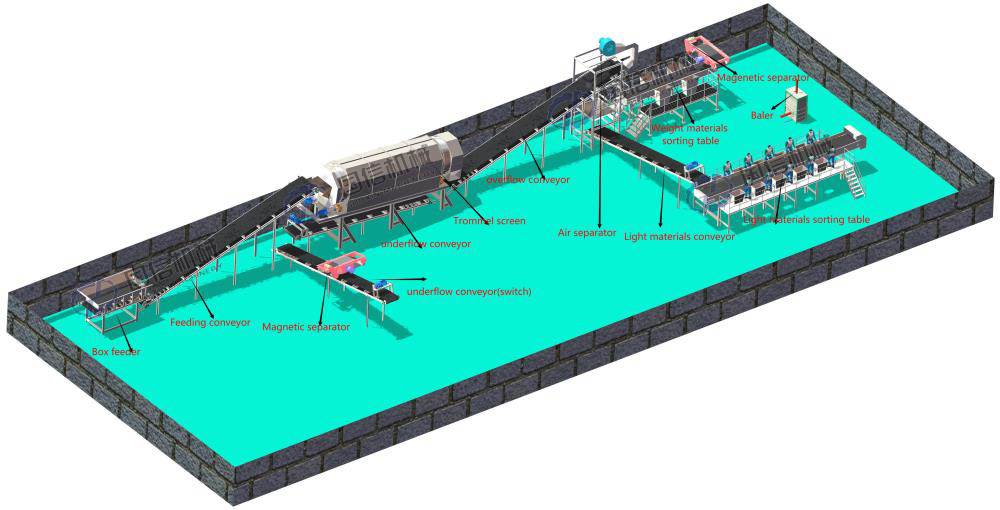 Seluruh sistem pemisah limbah biasanya mencakup pengumpan piring, penyebar bahan seragam, mesin penyaringan putar, mesin penampi, mesin pemisah magnetik, dan platform penyortiran manual, dan seterusnya. Kapasitas terbesar sistem ini adalah sekitar 400 ton per hari. Karena fasilitas pemilahan sampah membutuhkan area kerja yang cukup luas, klien perlu memastikan bahwa mereka memiliki cukup ruang untuk memasang pabrik daur ulang sampah.