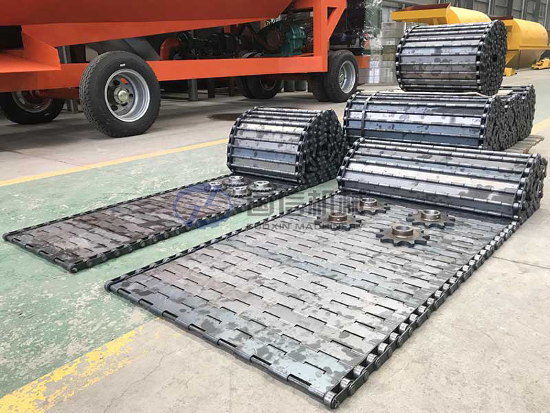 Sambungan dilengkapi dengan palung pengangkut tugas berat yang tumpang tindih untuk menjadi jalur pengangkut berkelanjutan yang mampu mengangkut material. Berat dan berat materialnya sendiri ditopang oleh beberapa baris rol, roda sproket, dan balok geser yang dipasang pada badan mesin.